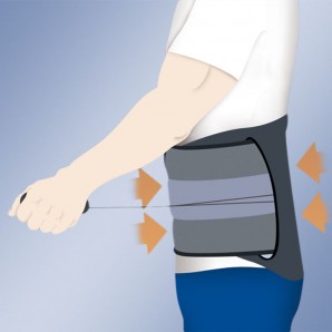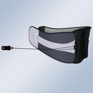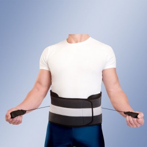 - Por su cara exterior, posee un marco termoplástico provisto de un sistema de poleas, que al traccionar los cordones ejercen una compresión selectiva de la zona lumbar y abdominal, permitiendo la regulación de la compresión a voluntad