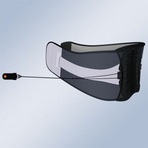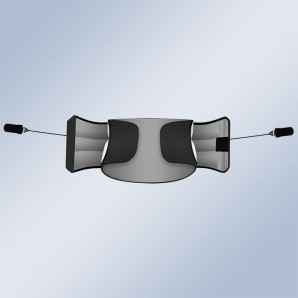 - De la misma zona por la cara exterior de lo ortesis, se encuentra un marco termoplástico provisto de sistema de poleas, que al traccionar los cordones ejercen una compresión selectiva de la zona lumbar y abdominal, permitiendo la regulación de la compresión a voluntad, a la vez que incluye en la zona abdominal por su cara interior una placa de compresión abdominal