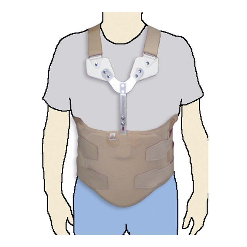 Consta del apoyo esternal, tirantes, una placa para el abdomen y todo lo necesario para su adaptación.