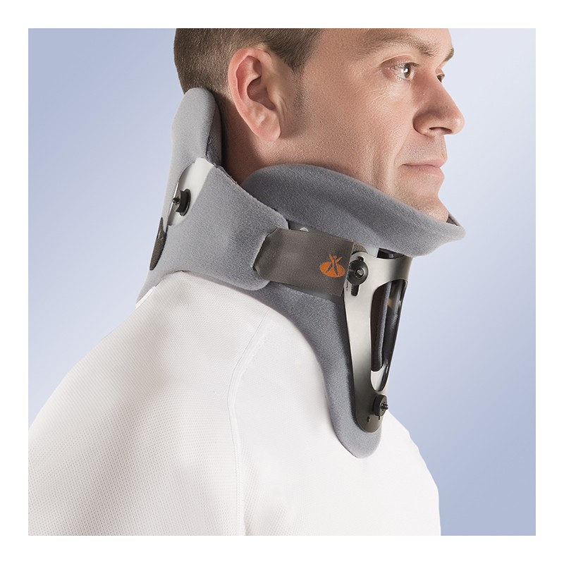 Collarín cervical compuesto por dos valvas acolchadas que evita las rozaduras.