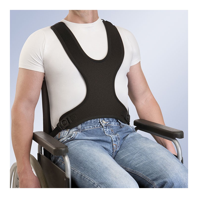 Arnés de chaleco pensado para conseguir una posición correcta en la silla de ruedas.