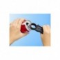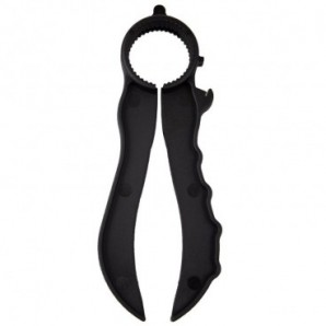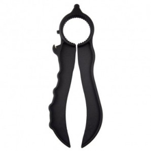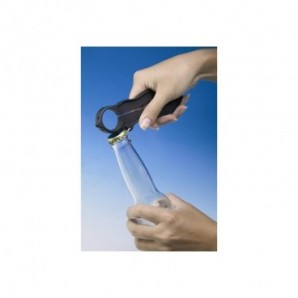 Abrebotellas de color negro fabricado en plástico. Su forma le permite abrir latas de refresco y tapones de rosca o chapa, entre otros envases. Su sencillo uso hace que sea el accesorio de cocina perfecto para personas con escasa fuerza o que sufren problemas en las articulaciones superiores.