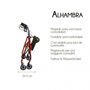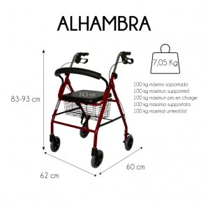 Andador para ancianos | Aluminio | Plegable | Freno en manetas | Asiento y respaldo | Cesta | Granate | Alhambra | Mobiclinic