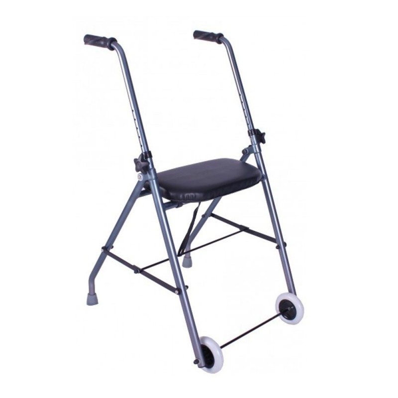 Andador rollator para ancianos, plegable y de dos ruedas. Este andador es muy ligero ya que su chasis esta fabricado en aluminio, lo que proporciona al usuario una movilidad más rápida y sencilla. Tiene un asiento de PVC acolchado muy cómodo que permite realizar descansos siempre que se necesite. Además gracias a su sistema de plegado fácil podrás transportarlo donde quieras. También dispone de puños anatómicos y ajustables en altura, para que se adapte perfectamente a cada usuario. Este andador es perfecto para utilizarlo tanto en lugar de interior como de exterior, su uso esta recomendado para personas que están realizando rehabilitación o bien para discapacitados o personas con problemas de movilidad.