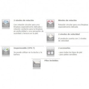 Funciona a través de baterías (Incluye 2 pilas de 1,5 V AAA) e incluye 2 niveles de rotación y 2 niveles de velocidad: Rotación circular: para una limpieza especialmente delicada Rotación oscilante: para la limpieza en profundidad y una sensación de suavidad y tersura en la piel