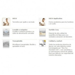 Características: Cuello / hombros. Cierre de imán. Superficie suave, transpirable y agradable al tacto. Sistema calentamiento ultrarrápido. Control temperatura electrónico. Interruptor de 3 potencias. Potencia 100 w. Sistema cable extraíble. Apagado automático a los 90 min aprox. Lavable a máquina a 40º. Botón de presión, se ajusta a cada persona. Producto homologado por Oeko-Tex Standard 100. Está sometido a un permanente control de calidad. (Largo x Ancho): 56 x 52 cm.