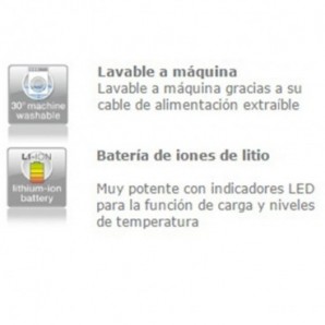Otras características: - Potencia 5 w. - Correa ancha de caucho con cierre de gancho, cómodo de llevar. - Apagado automático a los 90 min aprox. - Lavable a máquina a 30º. - Con cargador, tiempo de carga aprox. 2-3h. - Medidas (Largo x Ancho): 115 x 18 cm.
