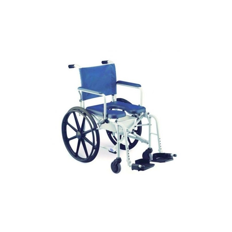 Silla ruedas de baño o ducha con inodoro para usuarios que necesitan asistencia para su higiene personal. Solución perfecta para las demandas domiciliarias e instituciones. Fabricada en aluminio resistente a la corrosión.