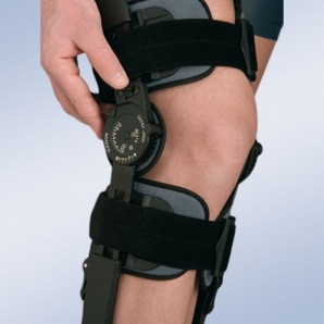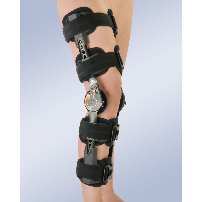 Ortesis de rodilla regulable indicado para rehabilitación de cirugía de ligamentos cruzados.